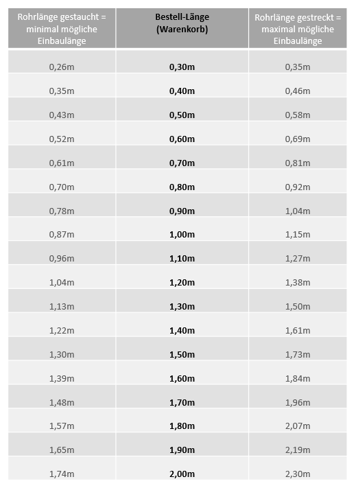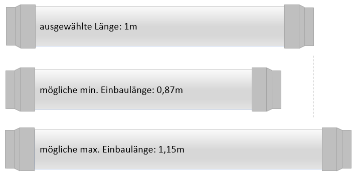 Tubecover-Rohrleitungen sind flexibel und aus dem gestauchten Zustand heraus min. 30% streckbar. Ihre bestellte Länge entspricht der mittleren Strecklage. Somit ist z.B. auch bei kurzen benötigten Rohrlängen ein einfacher Einbau zwischen zwei festen Verbindungspunkten möglich.